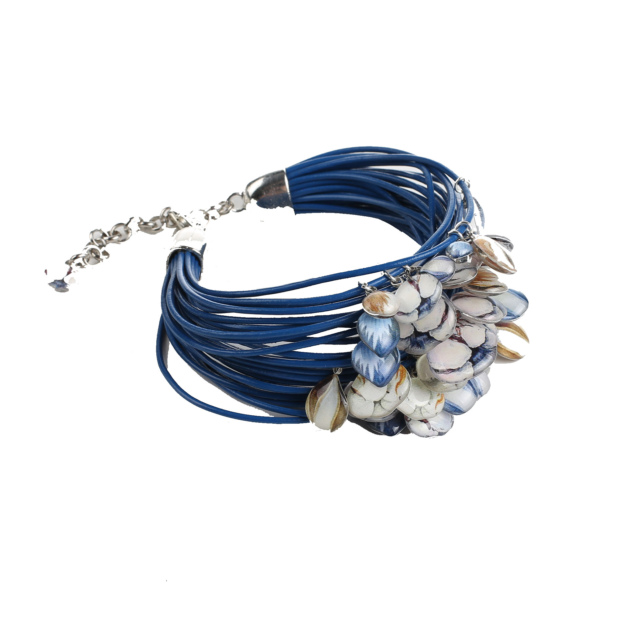 Браслет із фірмовими двосторонніми підвісками з ювелірної смоли у вигляді стилізованої бавовни.