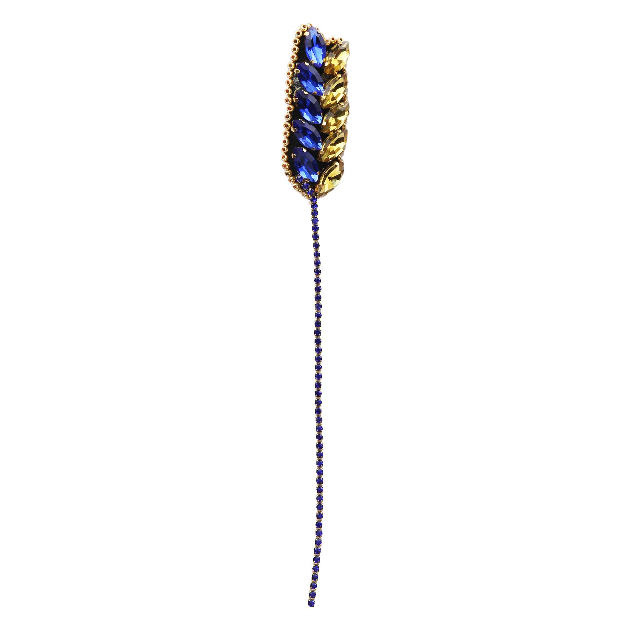 Брошка у вигляді колоска в синьо-жовтих кольорах з металевою защіпкою заді, яка прикріплена до кусочка шкіри.