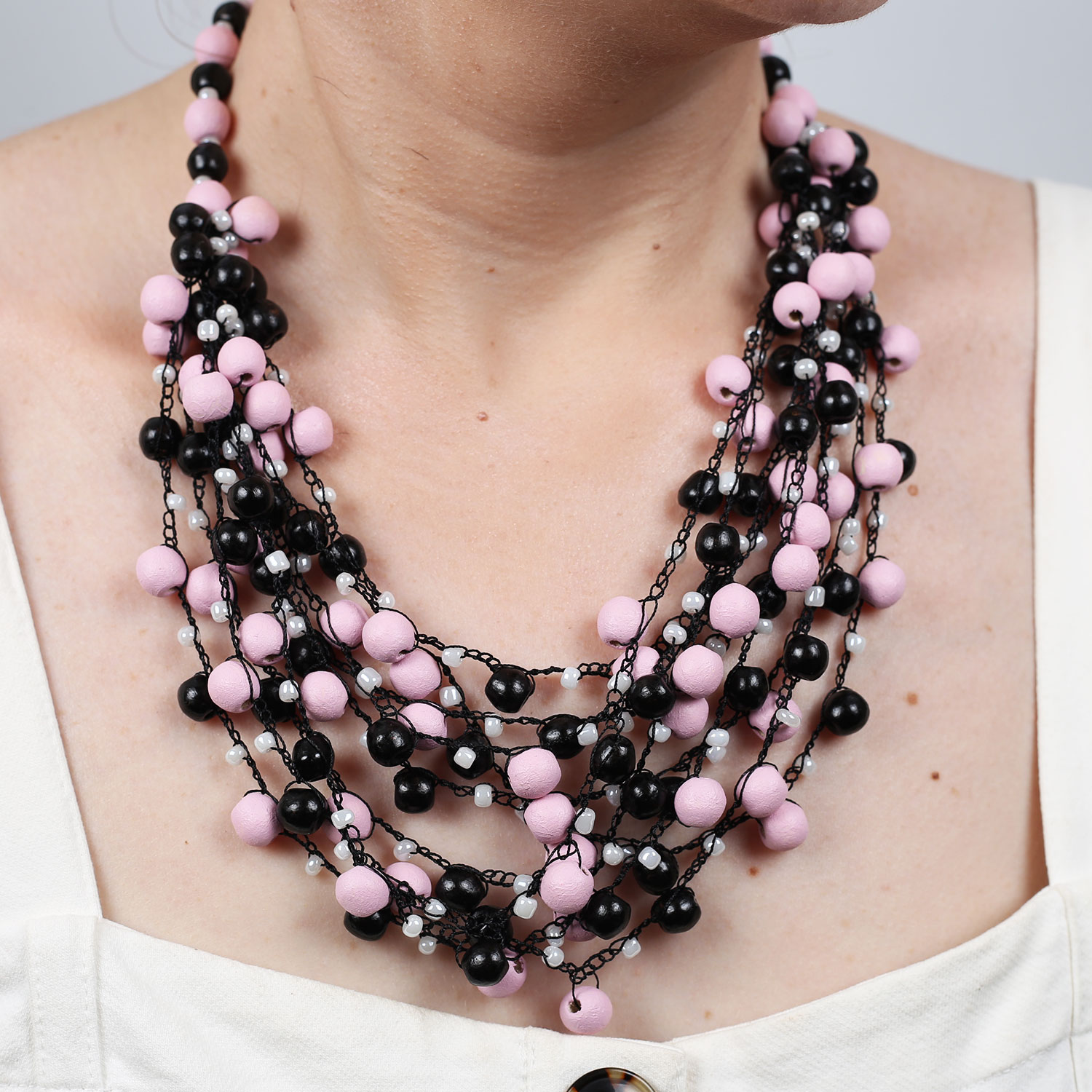 -Матеріал – дерев’яні намистинки, бісер , що нанизані на шовкову нитку. Колір рожево – чорний.
